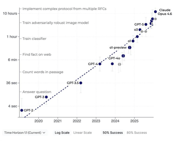 METR’s findings are significant. Over the past six years, the time horizon has doubled approximately every seven months. If this trend continues through the decade, AI agents could autonomously execute month-long projects (in human time). At that stage, a model would function as an autonomous agent, capable of navigating ambiguity and managing complex, multi-step decisions without human intervention.