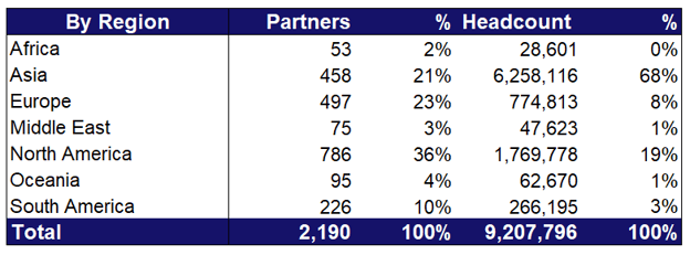 Approximately one third of AWS’s consulting and implementation partners are based in North America, while the majority of the workforce is concentrated in Asia, consistent with typical workforce distribution patterns in technology services organizations.