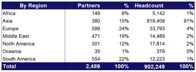 A quarter of Odoo’s services partners are based in Europe, while most of the total delivery workforce is based in Asia. This headcount distribution aligns with the typical delivery model of global technology services organizations.