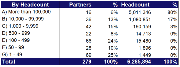 The distribution of Pega services partners by firm size is shown below.